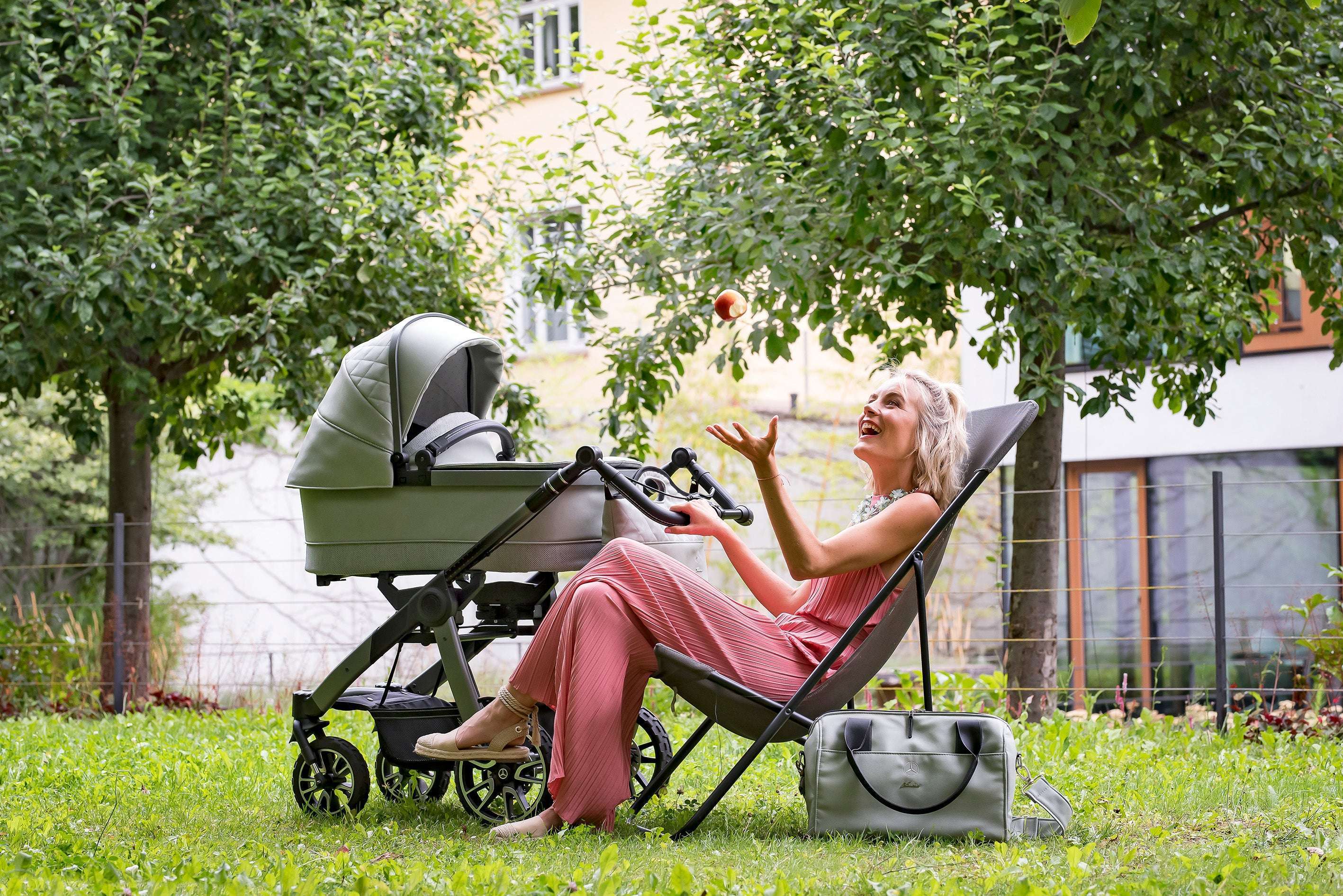 Das neue Kinderwagen-Modell „All-Terrain GTR“ ergänzt die beliebte Mercedes-Benz Collection, welche in Zusammenarbeit mit dem Mercedes-Benz Design Team entwickelt wurde, und ist die perfekte Wahl für alle Eltern, die in Sachen Qualität, Komfort und Stil keine Kompromisse machen. Ausgestattet mit superleichten, kugelgelagerten Luftkammerrädern mit Grip-Bereifung bietet der All-Terrain GTR Kinderwagen maximale Geländegängigkeit. Die extragroßen, feststellbaren Einzelschwenkräder mit Federung sorgen für ein komfortables Fahrerlebnis auf jedem Untergrund. Die GTR-Sitzeinheit ist im Handumdrehen vom Gestell abnehmbar und wendbar. Der magnetische 5-Punkt Sicherheitsgurt und der abnehmbare Schutzbügel mit Einstiegsfunktion und Sicherheitsverschluss bieten optimale Sicherheit für die Kleinsten. Das innovative Quick Fix Gurtsystem ermöglicht ein schnelles und sicheres Anschnallen des Kindes. Dieses neue Feature, das bei allen GTR-Sitzeinheiten zum Einsatz kommt, sorgt für eine einfache und schnelle Anpassung des Gurtsystems an die Bedürfnisse der Kleinen. Die mehrfach verstellbare Rückenlehne kann bis in die flache Liegeposition verstellt werden. Die Klimazone im Verdeck sorgt für optimale Luftzirkulation im Kinderwagen. Hinzu kommt die doppelt ausklappbare Sonnenblende, welche für den optimalen Sonnenschutz des Nachwuchses sorgt. Der All-Terrain GTR Kinderwagen verfügt auch über eine extralange, mehrfach verstellbare Fußstütze. Der höhenverstellbare Schiebergriff ermöglicht es Eltern unterschiedlicher Größe, den Kinderwagen bequem zu schieben.