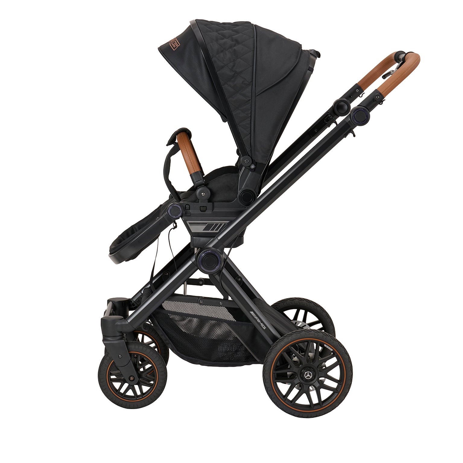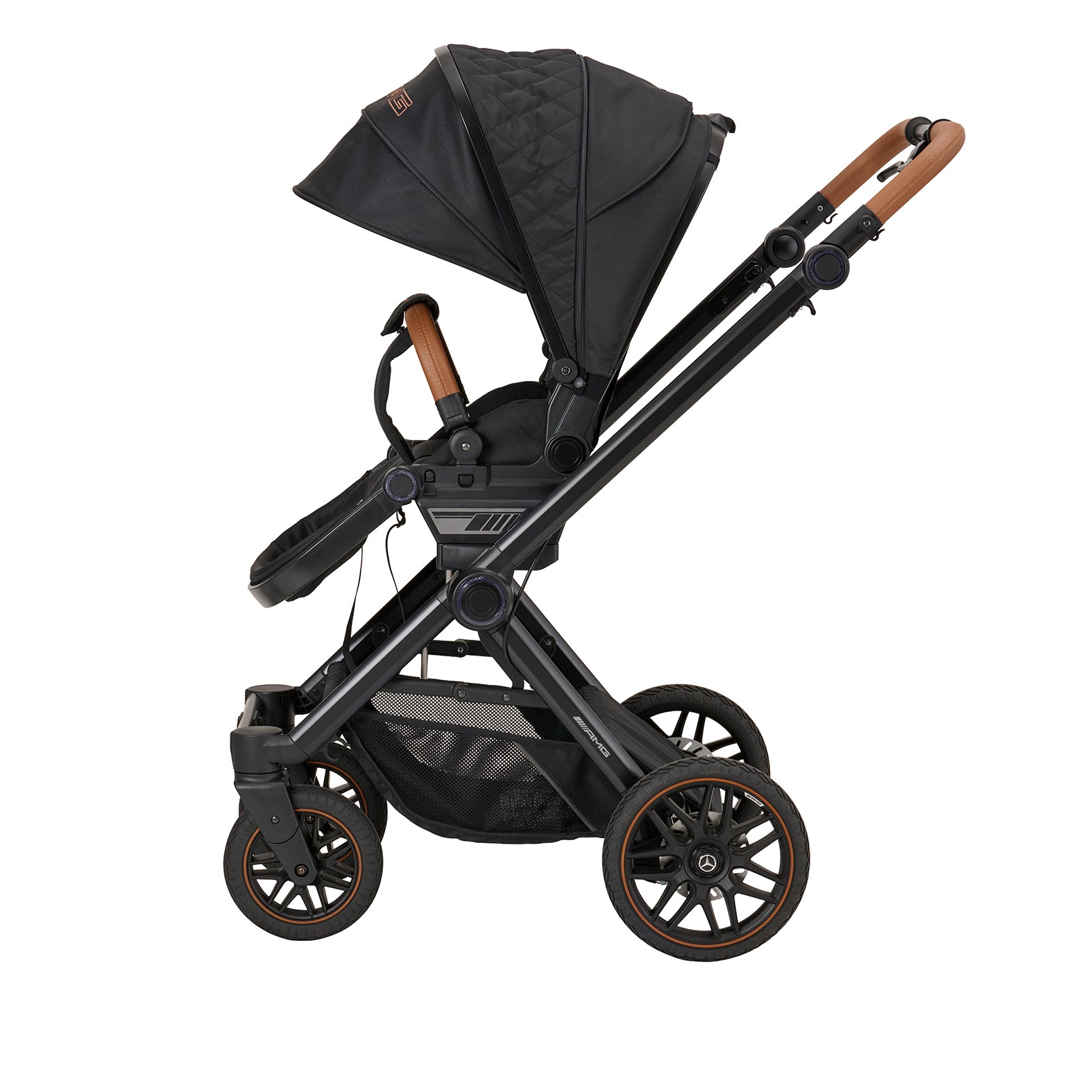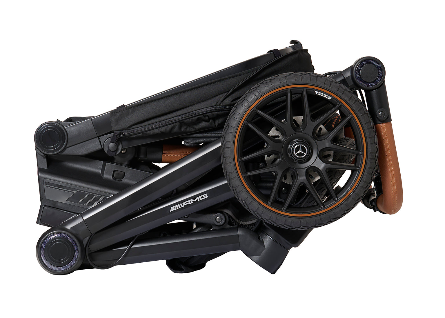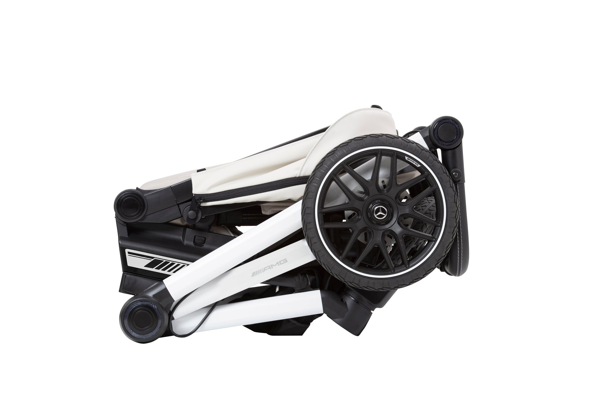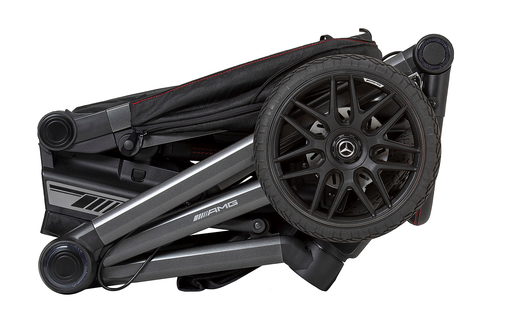 Mit einem kompakten Faltmaß von 71 x 58,5 x 32 cm lässt sich der AMG GT² pushchair samt Sitzeinheit blitzschnell zusammenklappen – ideal für unterwegs und für kleine Kofferräume. Die hochwertigen Schwenkräder mit Federung meistern jedes Terrain, während die Kreuzspeichenfelgen im original AMG Design für eine unverwechselbare Optik sorgen.