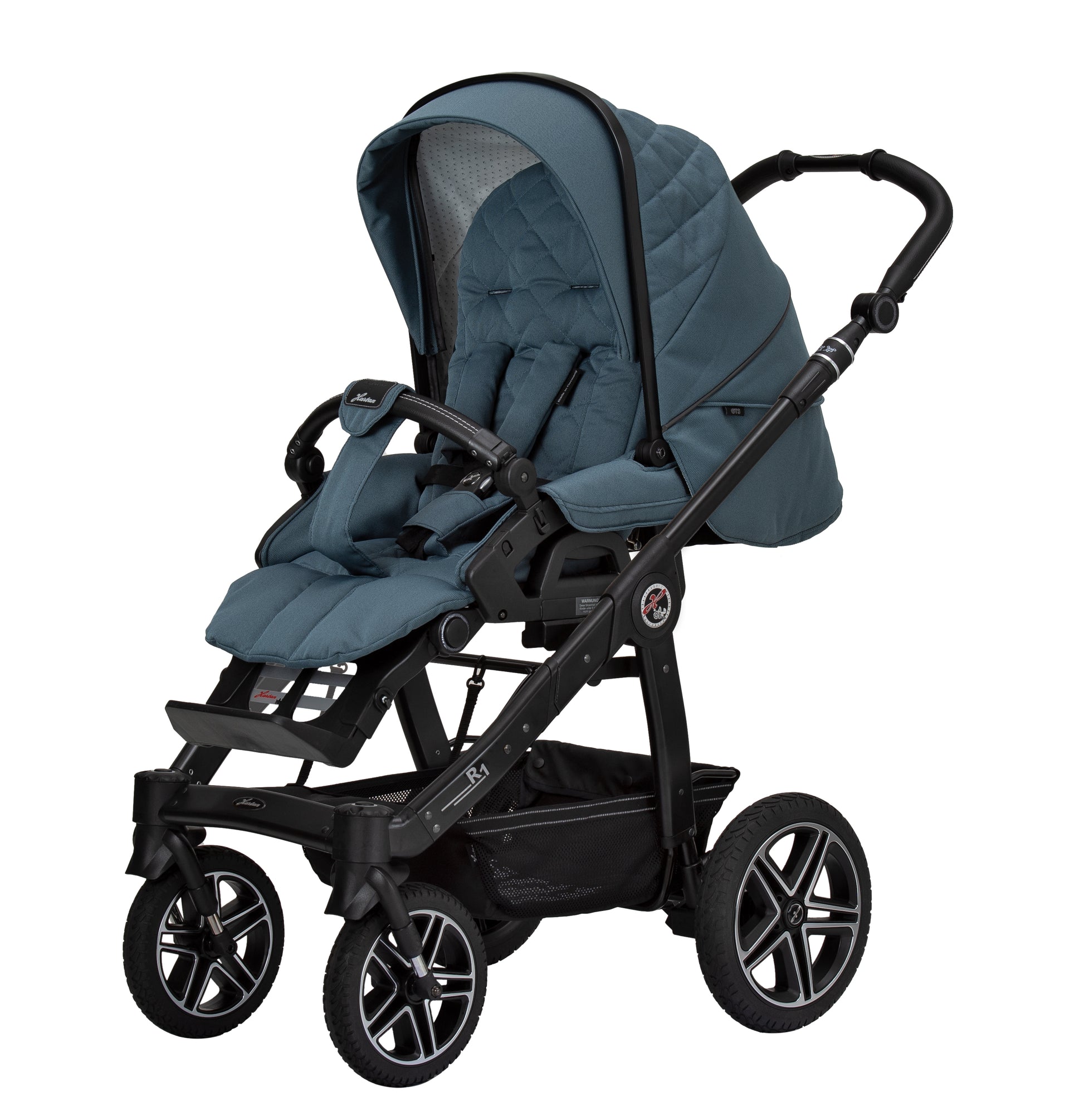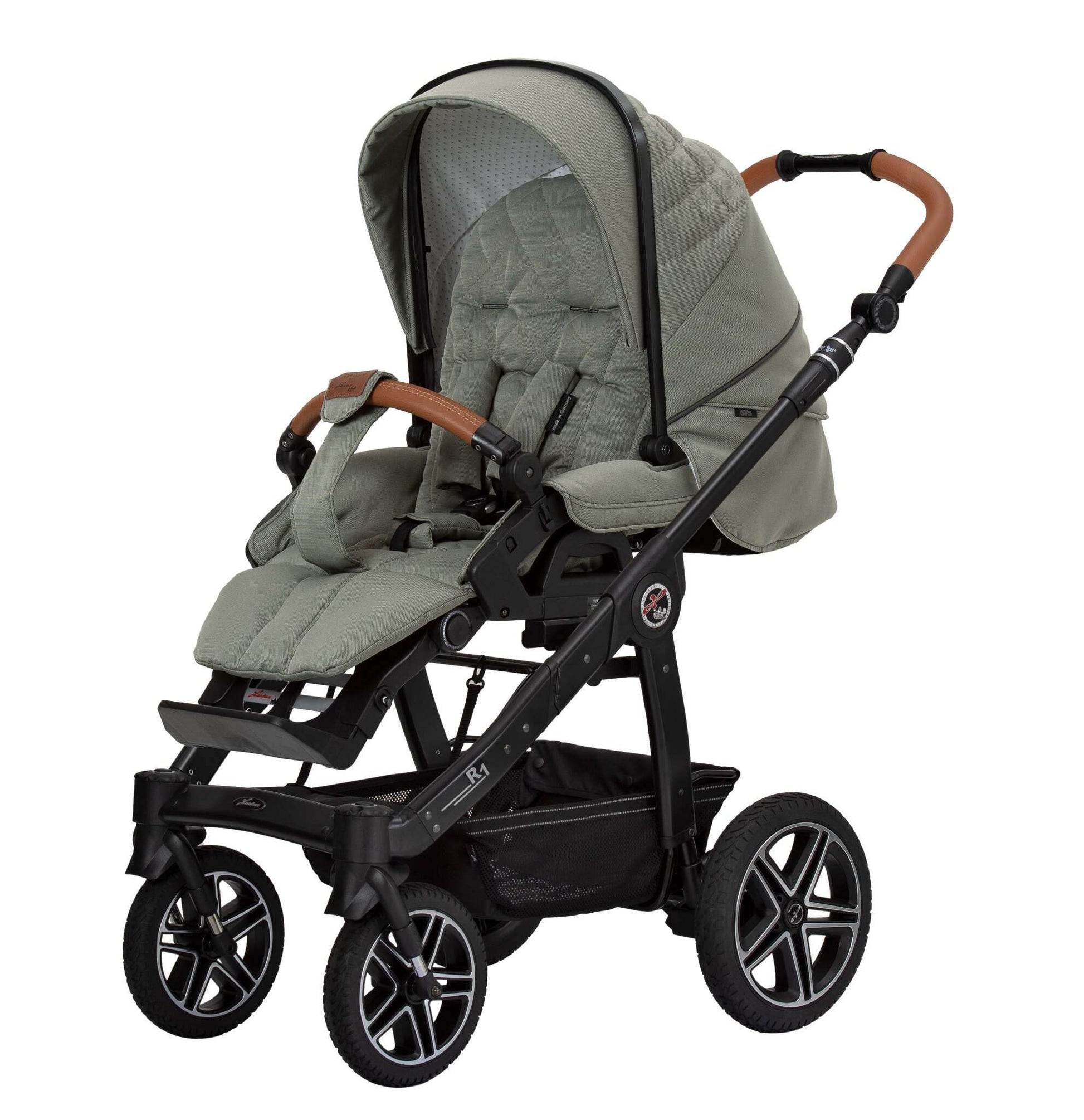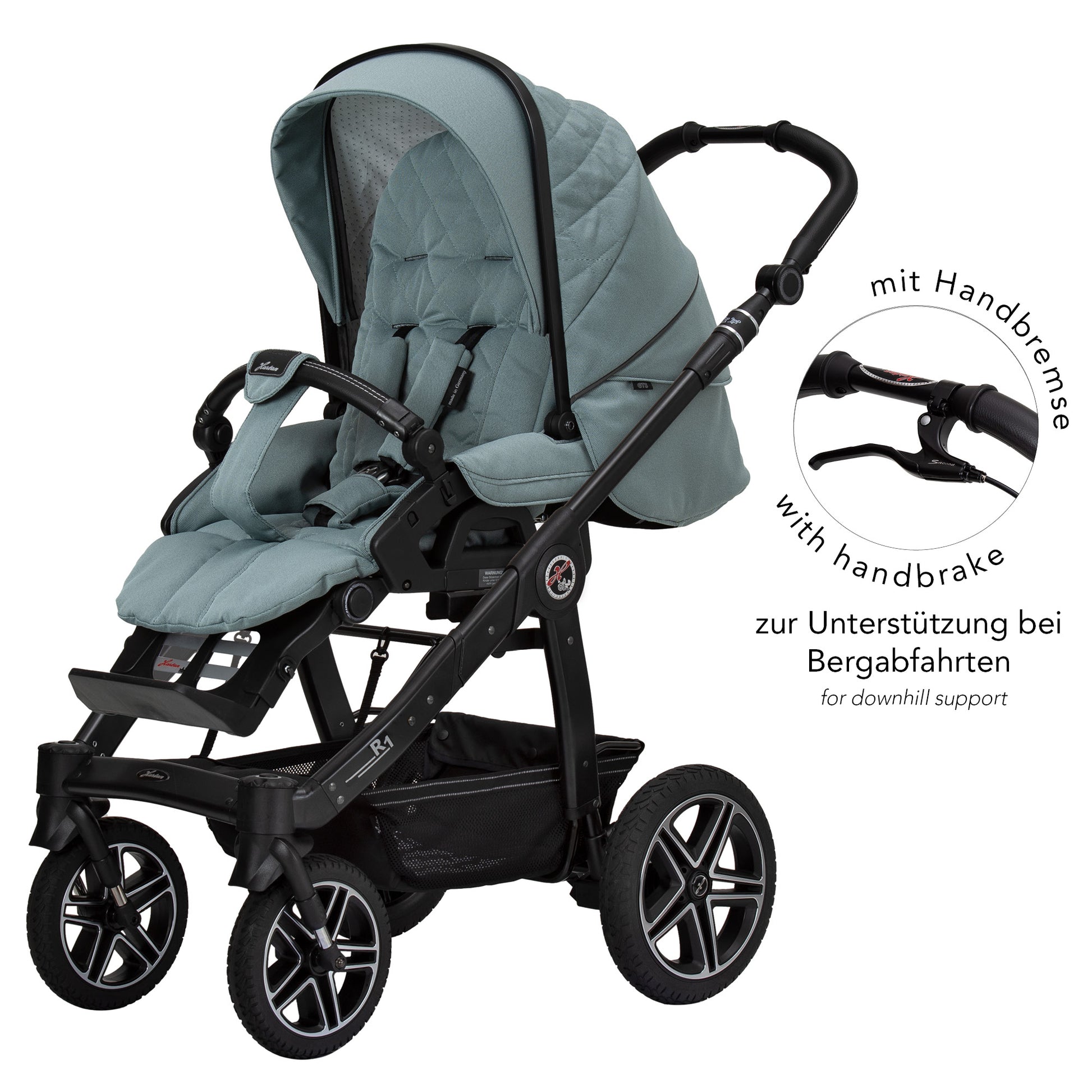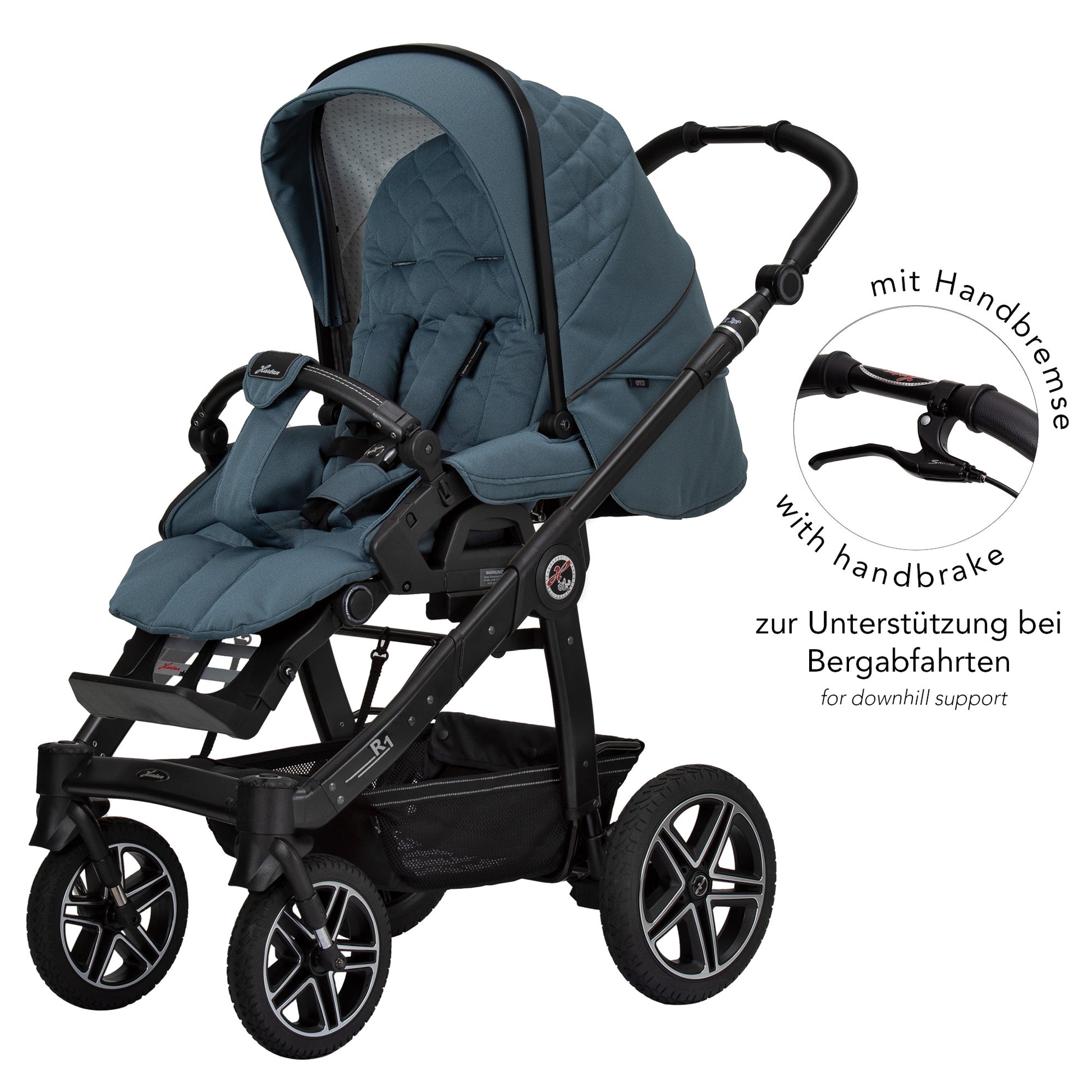 Beim Kinderwagen R1 GTS aus der Selection Collection gibt die optional erhältliche Handbremse am Griff Sicherheit in jedem Gelände. Die gefederten, extragroßen Fronträder bieten optimale Fahreigenschaften auf jedem Untergrund: Als Schwenkräder meistern sie den City-Parcour. Fest arretiert bleiben sie auch auf der Adventure-Tour über Stock und Stein sicher in der Spur. Der Kinderwagen R1 GTS überzeugt mit purer Fahrfreude ebenso wie in puncto sportlichem Auftritt – ein echter Sportwagen eben.