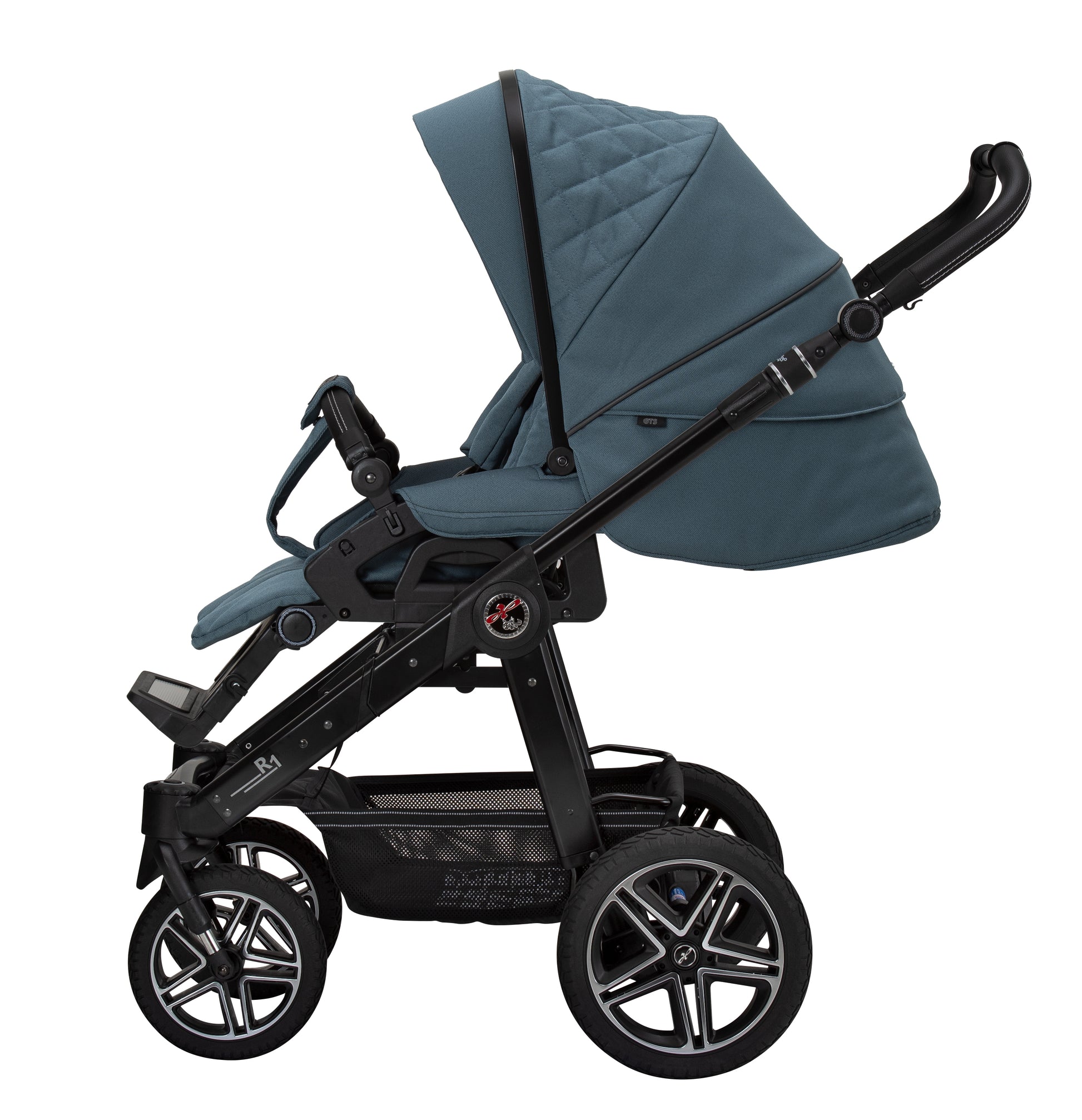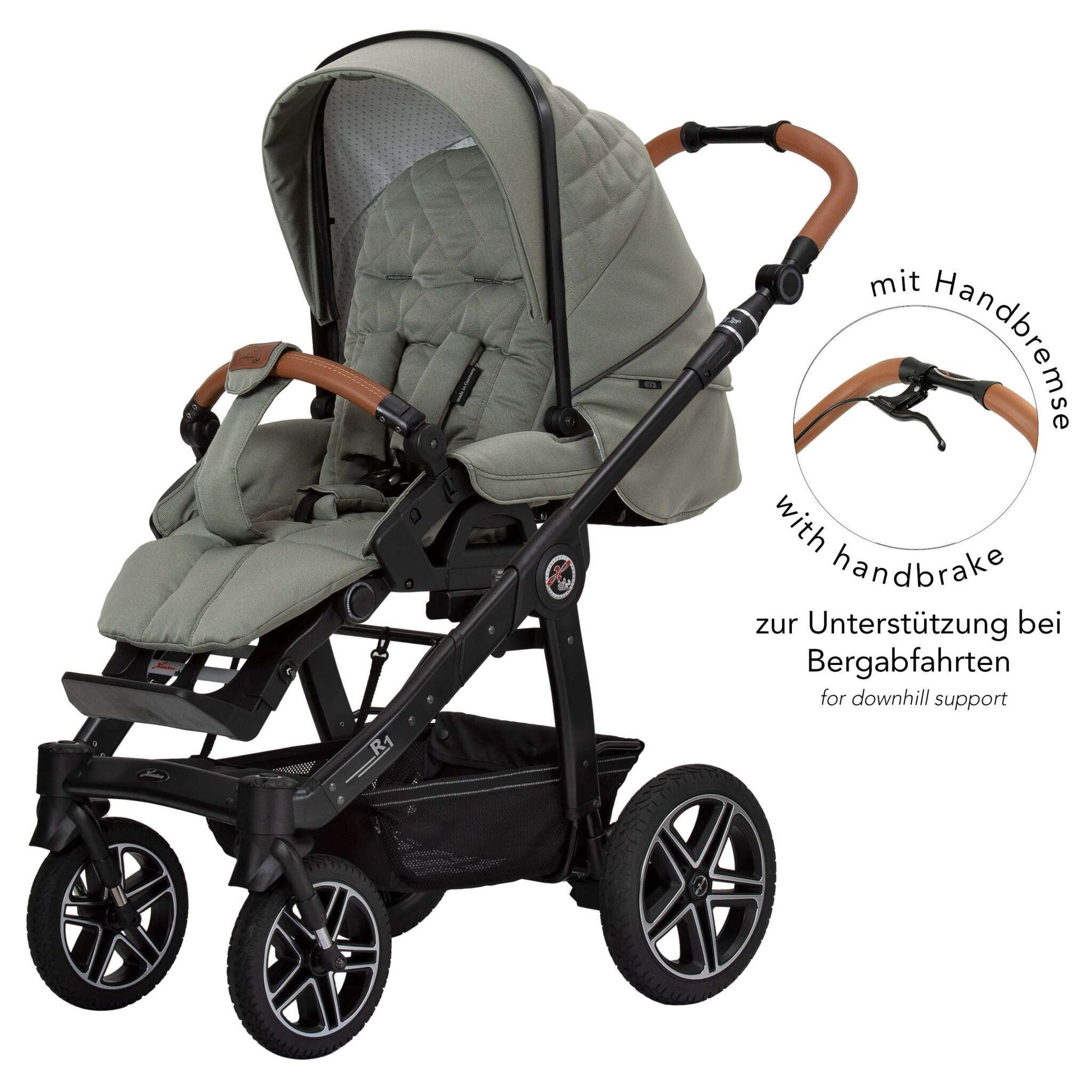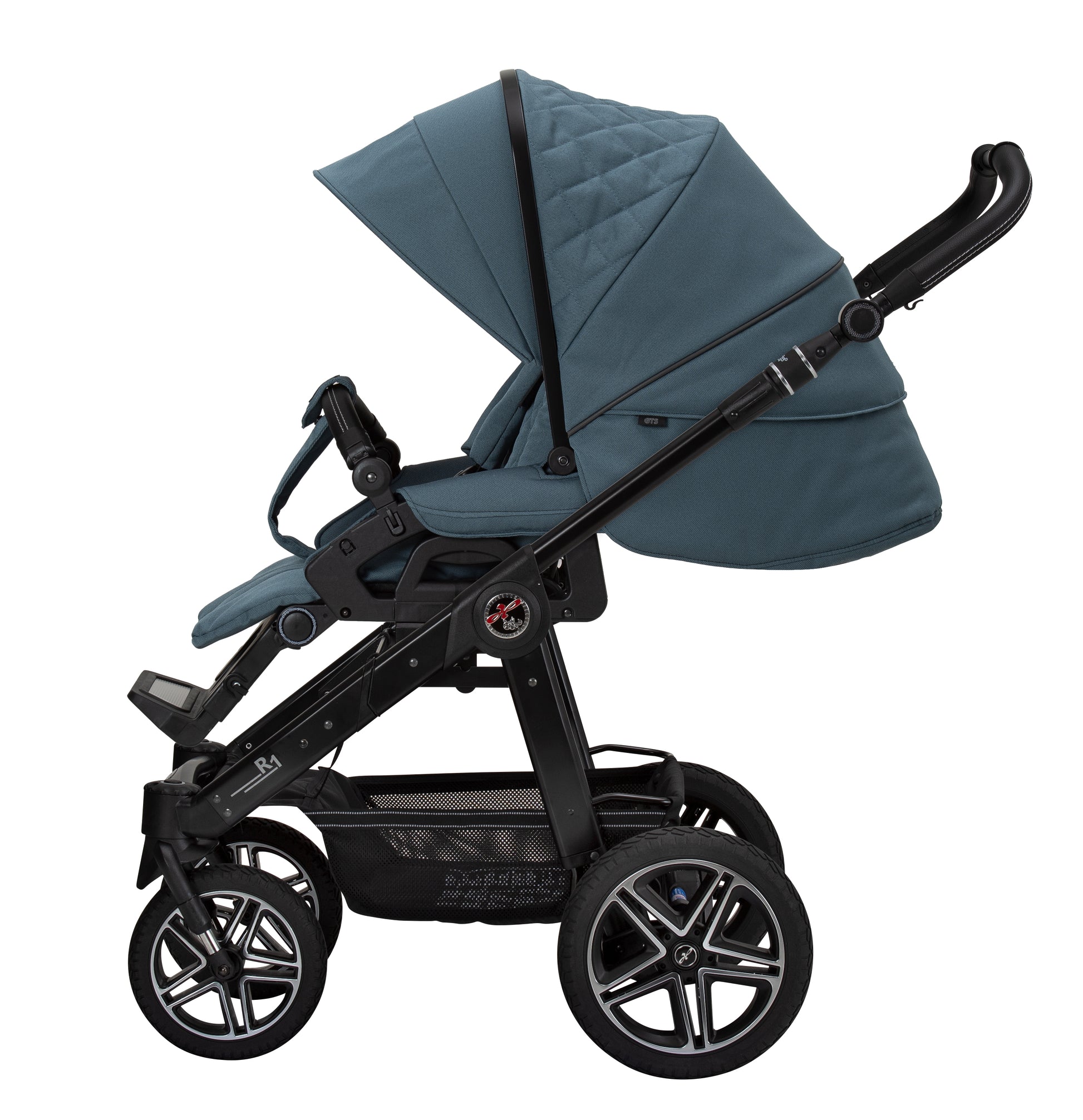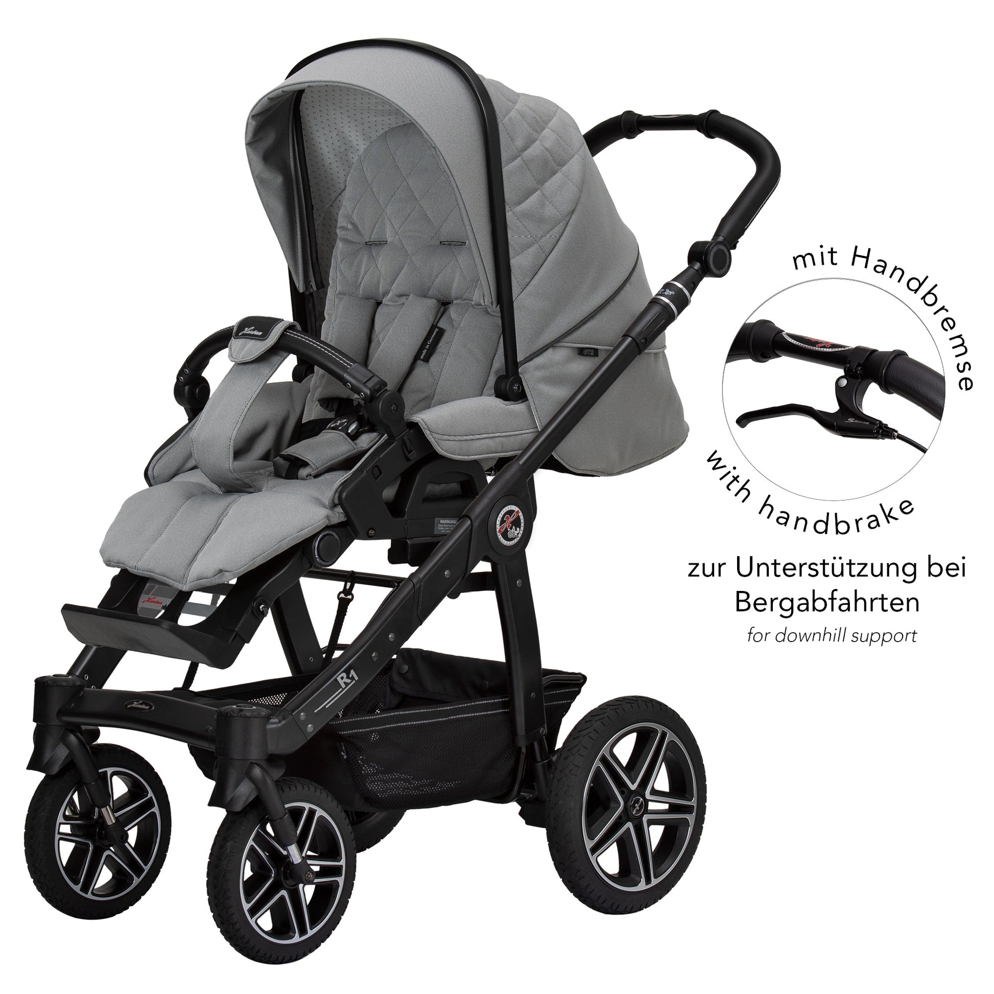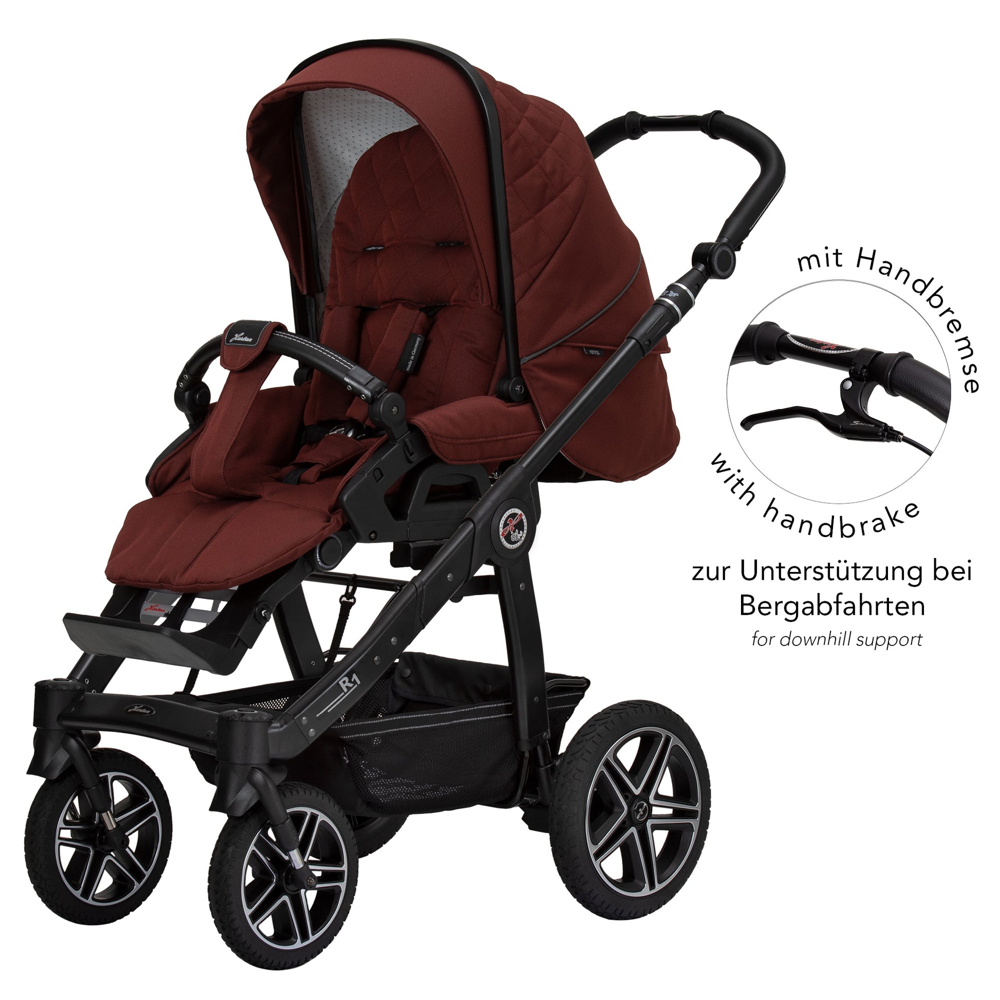 Beim Kinderwagen R1 GTS aus der Selection Collection gibt die optional erhältliche Handbremse am Griff Sicherheit in jedem Gelände. Die gefederten, extragroßen Fronträder bieten optimale Fahreigenschaften auf jedem Untergrund: Als Schwenkräder meistern sie den City-Parcour. Fest arretiert bleiben sie auch auf der Adventure-Tour über Stock und Stein sicher in der Spur. Der Kinderwagen R1 GTS überzeugt mit purer Fahrfreude ebenso wie in puncto sportlichem Auftritt – ein echter Sportwagen eben.