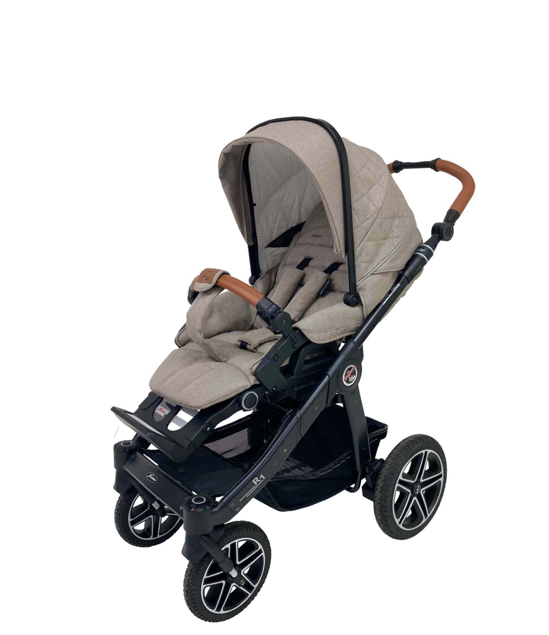 Die gefederten, extragroßen Fronträder bieten optimale Fahreigenschaften auf jedem Untergrund: Als Schwenkräder meistern sie den City-Parcour. Fest arretiert bleiben sie auch auf der Adventure-Tour über Stock und Stein sicher in der Spur. Der Kinderwagen R1 GTS überzeugt mit purer Fahrfreude ebenso wie in puncto sportlichem Auftritt – ein echter Sportwagen eben.